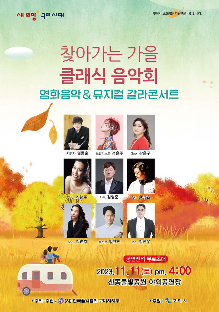 [구미=박병상 기자]경북 구미시는 11일 산동 물빛 공원 야외공연장에서 (사)한국음악협회 구미시지부(대표 권동출) 주관으로 찾아가는 가을 클래식 음악회를 개최한다.