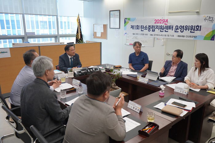 | ▲ 안산환경재단은 지난 29일, 재단 대표이사 집무실에서 2025년도 제1회 안산시탄소중립지원센터 운영위원회를 진행하고 있다 /사진제공=안산환경재단 |