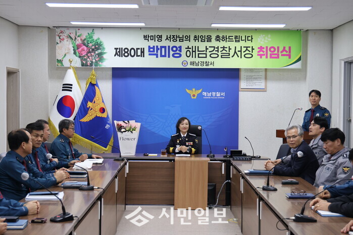 전남 해남경찰서는 지난 29일 경찰서 2층 호산당에서 각 과·계장, 지역관서장 등 약 40명이 참석한 가운데 박미영 총경 해남경찰서장 취임식을 개최했다.
