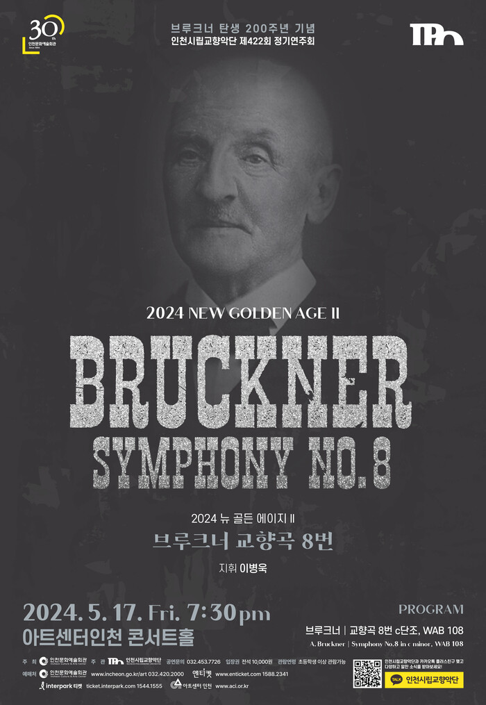 장대한 클라이맥스로 우리의 마음을 뒤흔들 인천시립교향악단 제422회 정기연주회 <2024 뉴 골든 에이지 II - 브루크너 교향곡 8번>의 티켓 가격은 전석 1만원이며 아트센터인천, 엔티켓 및 인터파크 티켓에서 예약 가능하다.