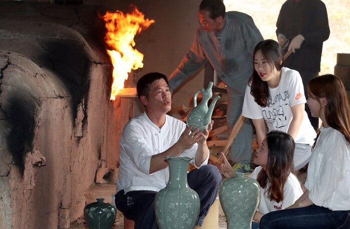 | ▲ 강진고려청자 화목가마에서 구어낸 비색의 주병 상태를 살펴보고 있는 강진도자기 도예가와 전통도자기 체험에 나선 관광객들 . / 자료사진=강진군 제공 |