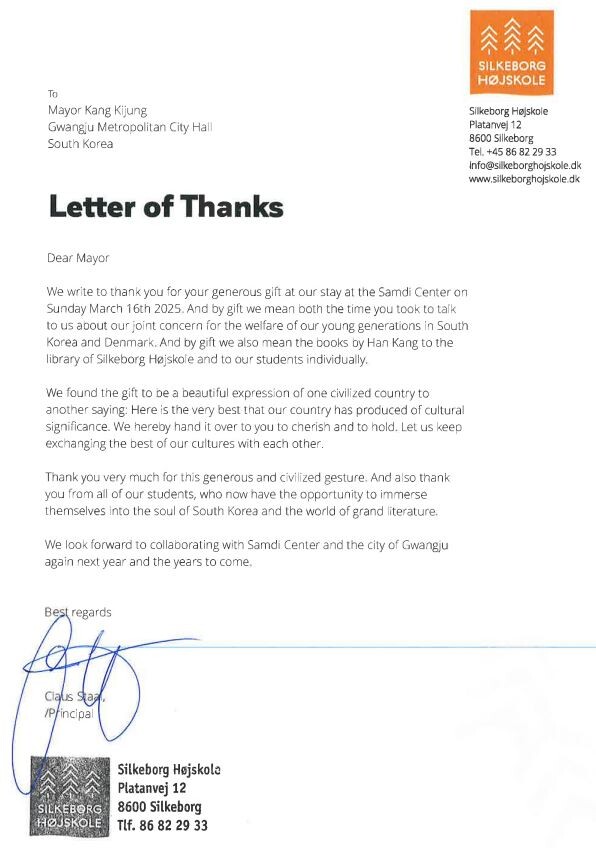 | ▲ 덴마크 실케보르 시민학교 감사편지 이미지 / 광주광역시 제공 |