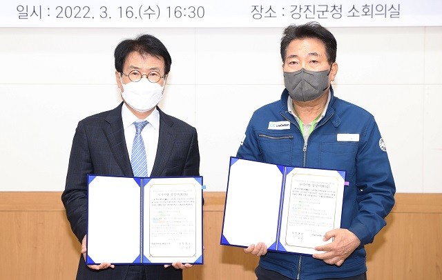 [강진=정찬남 기자] 전남 강진군은 지난 16일 강진군청 소회의실에서 전처리 탈황제 생산업체인 ㈜로우카본(대표 이철)과 1조 원 규모의 투자이행협정(MOA)을 체결했다.