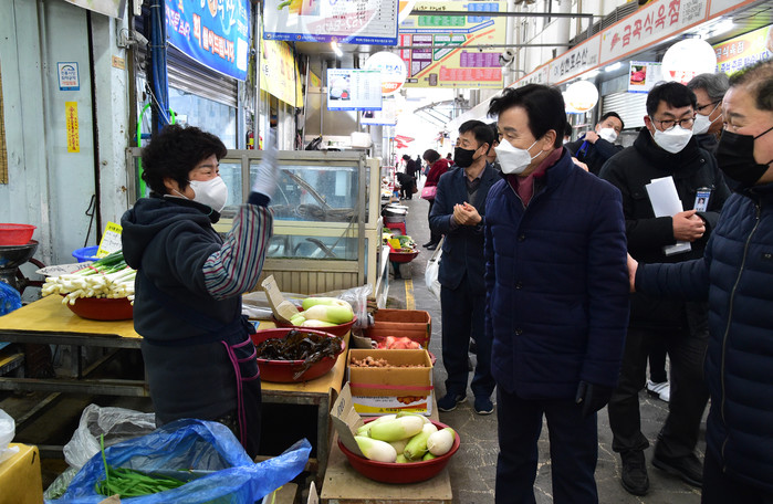 진주시(시장 조규일) 공무원들이 지난 25일 자유시장을 방문해 설맞이 전통시장 장보기 및 코로나19 특별 방역점검에 나섰다.
