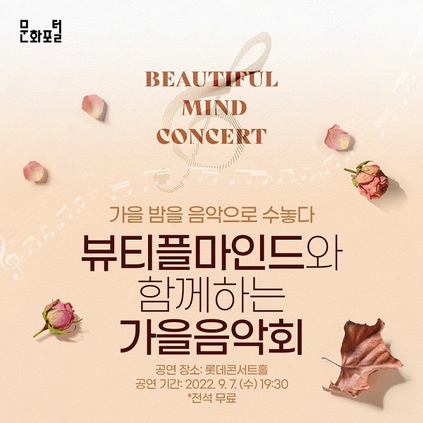 ‘뷰티플마인드와 함께하는 가을음악회’에서는 지휘자 이원숙을 필두로 한 뷰티플마인드 뮤직아카데미의 재학생과 수료생으로 구성된 ‘뷰티플마인드 오케스트라’가 아름다운 공연을 선사한다. 이들은 장애와 비장애의 경계를 허무는 공연을 선보이며 모두가 음악으로 연결되는 세상을 그린다.