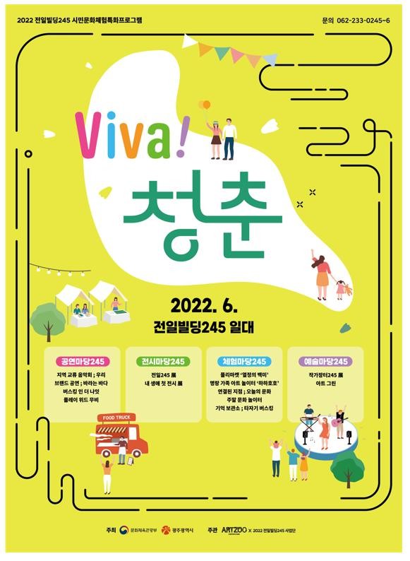 오는 4일부터 진행되는 주요 문화예술 프로그램은 ▲광주와 타지역 아티스트의 교류 공연인 지역 교류 음악회 ‘우리’ ▲매월 전일빌딩245 일대를 무대로 펼쳐지는 주제가 있는 ‘브랜드 공연–바라는 바다’ ▲무성영화에 맞춰 즉흥연주를 펼치는 ‘플레이 위드 무비’ ▲피크닉 존과 다양한 볼거리가 함께하는 플리마켓 ‘열정의 백미’ ▲유아 및 초등생 동반 가족 대상 문화예술교육 프로그램인 명랑 가족 아트 놀이터 ‘하하호호’ ▲전일빌딩245 1층 로비에서 진행되는 일일 문화예술 체험 프로그램 ‘주말 문화 놀이터’, ‘연결된 지점–오늘의 문화’ ▲지역 작가와 협업해 진행하는 현대미술 교육 프로그램 ‘아트 그린’ 등이다.