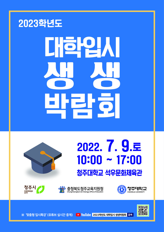 청주시는 수도권에 비해 상대적으로 정보의 양이 부족한 우리 지역 수험생들에게 대학입시 정보를 제공하기 위한 2023학년도 대학입시 생생박람회가 7월 9일 토요일, 오전 10시부터 오후 5시까지 청주대학교 석우문화체육관에서 개최된다.