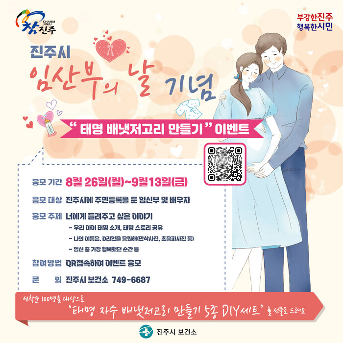 진주시에 주민등록을 둔 임신부 또는 배우자를 대상으로 진행되는 이번 이벤트는 ▲우리 아이 태명 소개, 태명 스토리 ▲D라인을 응원해, 임신 중 가장 행복했던 순간 등 사진, 편지, 메시지 등의 자유로운 형식으로 응모를 하면, 선착순 응모자 100명에게 ‘태명 자수 배냇저고리 만들기 5종 DIY세트’를 제공한다.