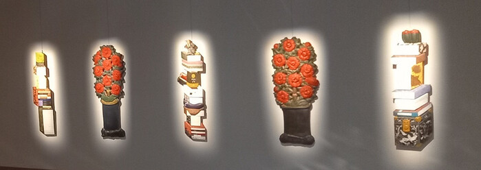 얼핏 너무나도 전통적인 조선시대 책거리도 같은 ‘부귀영화’ 시리즈 작품들을 자세히 들여다본다면, 작가가 독서 모임을 통해 접했던 다양한 현대 소설들을 비롯한 화장품, 녹차 상자 등 현대 물건들이 놓여 있다.