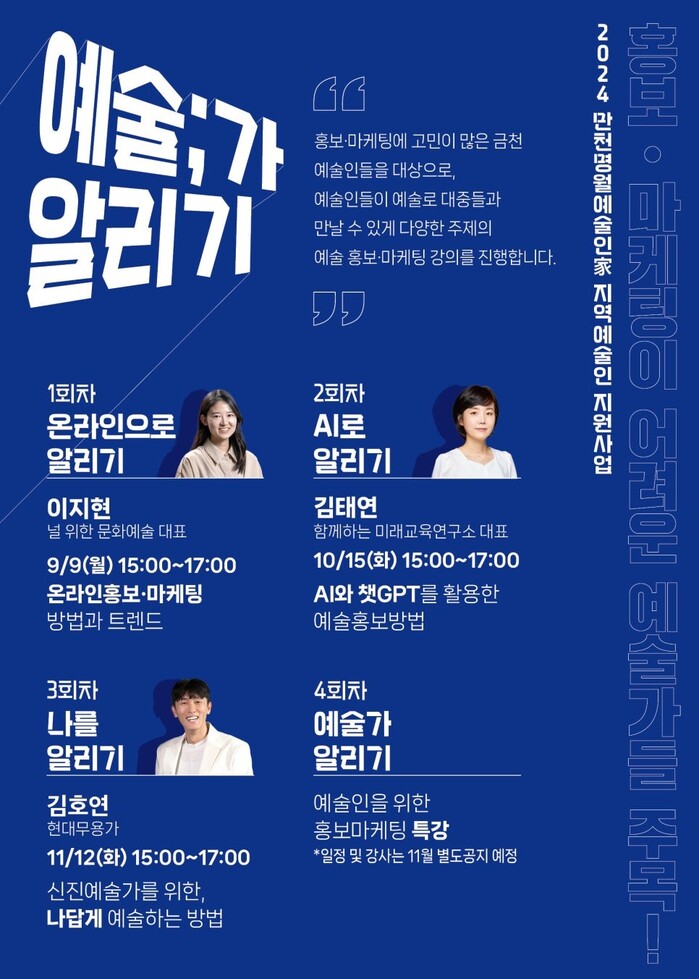 특강은 2024년 9월부터 12월까지 만천명월예술인家 4층에서 매월 1회씩 열리며, 각 분야의 전문가들이 강연자로 참여한다. 강연자에는 함께하는 미래교육연구소 김태연 대표와 문화예술 채널의 이지현 대표, 현대무용가 김호연 등이 포함되어 있다. 이들은 홍보·마케팅이 어려운 예술인들에게 실질적인 도움을 줄 수 있는 다양한 주제의 강의를 선보일 예정이다.