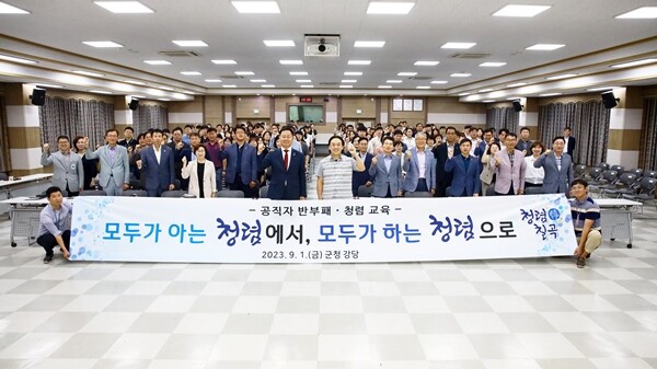 이날 교육은 군수, 간부공무원, 승진자 등 전 직원을 대상으로 연극배우 출신인 정승호 청렴 전문강사를 초빙해 갑질 교육을 포함한 공무원 행동강령, 이해충돌방지법에 대해 강연을 했다.