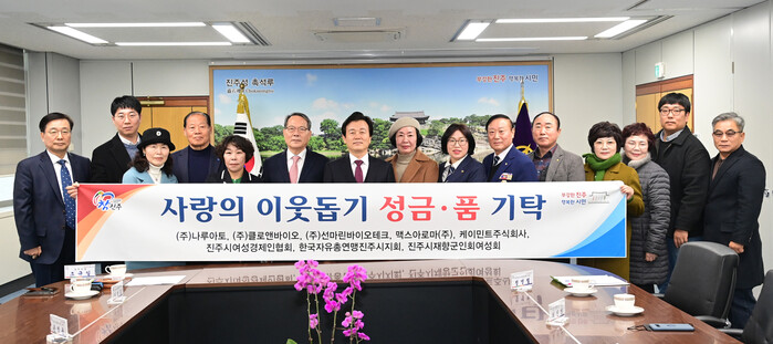 진주바이오산업진흥원 입주기업협의회 업체인 ㈜나루아토(대표 변홍주)에서 성금·품 100여만 원 상당, ㈜클로앤바이오(대표 최진영)에서 성품 72여만 원 상당, ㈜선마린바이오테크(대표 박시향)에서 성품 188여만 원 상당, 맥스아로마(주)(대표 하재순)에서 성품 320여만 원 상당, 케이민트(주)(대표 전광석)에서 성품 49여만 원 상당을 기탁했다.