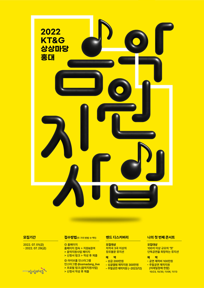 ‘2022 KT&G 상상마당 홍대 음악지원사업’의 자세한 정보와 접수 방법은 KT&G 상상마당 홈페이지와 라이브홀 인스타그램에서 확인할 수 있다.