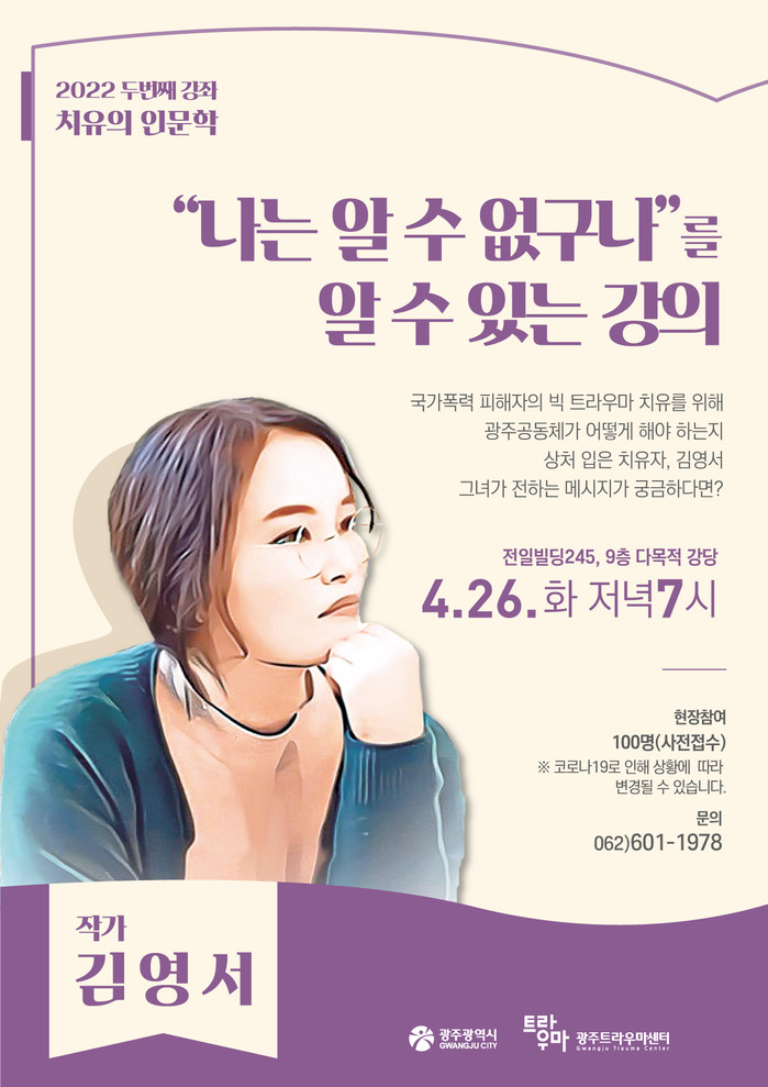 이번 강연에서는 김영서 작가가 ‘나는 알 수 없구나를 알 수 있는 강의’라는 주제로 작가 본인이 겪은 트라우마 상처와 그 상처를 극복하고 세상 앞에 나서기까지의 이야기를 공유한다.