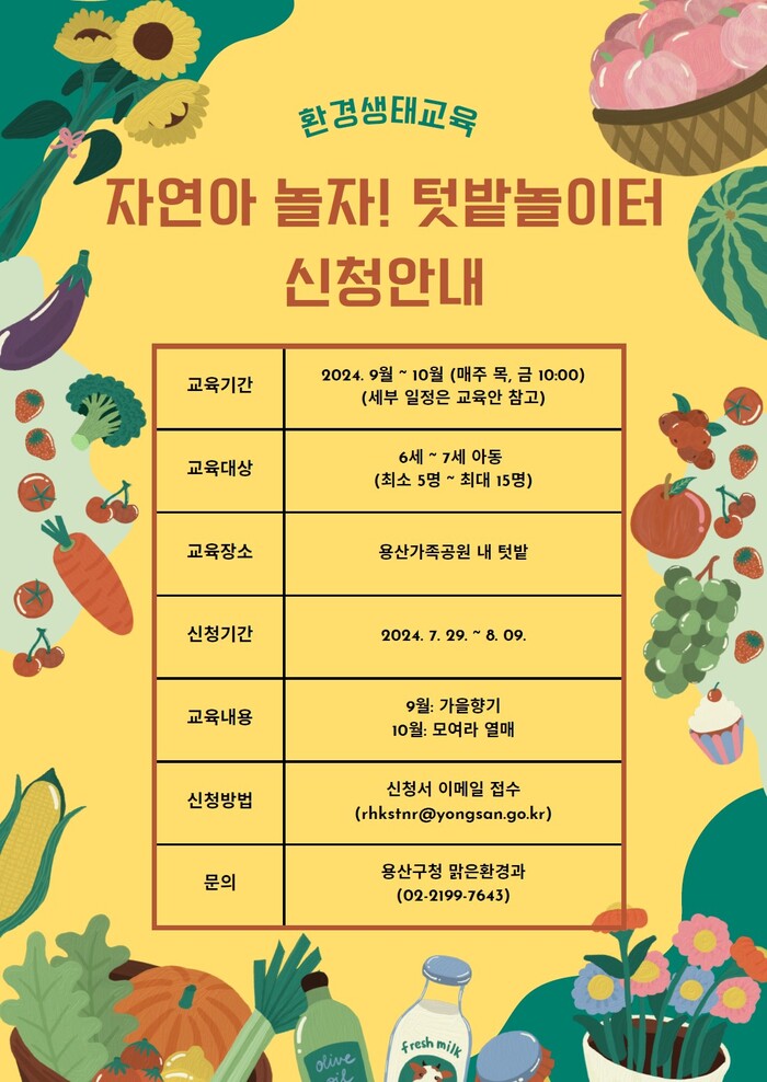 구에 따르면 어린이 생태 환경교육 주요 내용은 ▲9월 ‘가을 향기’ ▲10월 ’모여라~열매’로 용산가족공원 텃밭에서 진행된다.