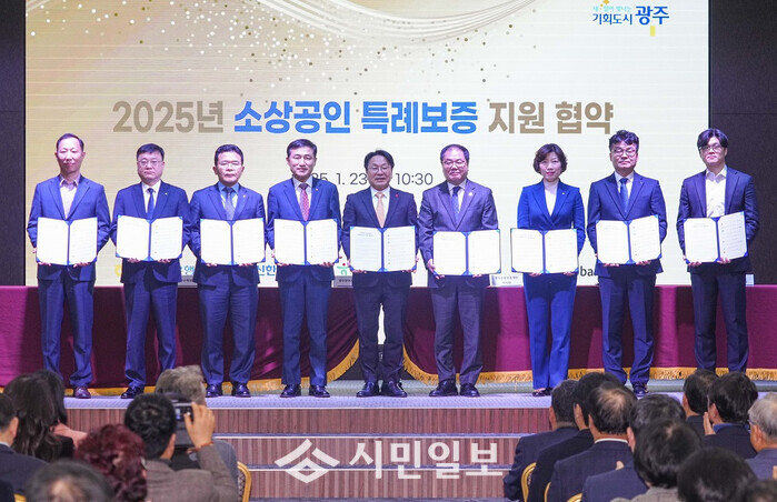 | ▲ 강기정 광주광역시장(사진 가운데)이 ‘2025 광주경제 다함께 착착착’ 행사가 열린 지난 1월23일 광주상공회의소 대회의실에서 광주신용보증재단, 광주은행, KB국민은행, NH농협은행, 신한은행, 하나은행, 우리은행, 카카오뱅크 등 8개 관계기관과 함께 ‘2025년 소상공인 특례보증 지원 협약’을 한 후 기념촬영을 하고 있다./ 광주광역시 제공 |