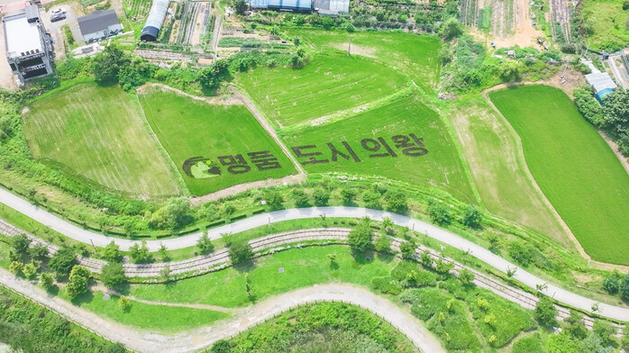 논을 배경으로 조성된 ‘농촌 경관 벼 아트’는 색이 다른 벼를 정교하게 배치해 문구와 로고를 동시에 형상화한 것으로, 시의 정체성과 농업의 아름다운 조화를 시각적으로 잘 보여주고 있다.