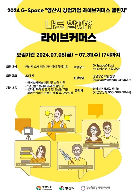 [양산=최성일 기자] 양산시는 동부 경남 창업지원 거점인 G-스페이스 동부(G-Space@East)에서 ‘2024년 G-Space 라이브커머스 챌린지’에 참여할 업체를 모집한다고 밝혔다.