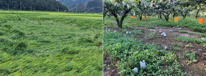 | ▲ '힌남노' 태풍 피해를 입은 벼 농경지와 과수농가의 낙과 / 사진=강진군 제공 |