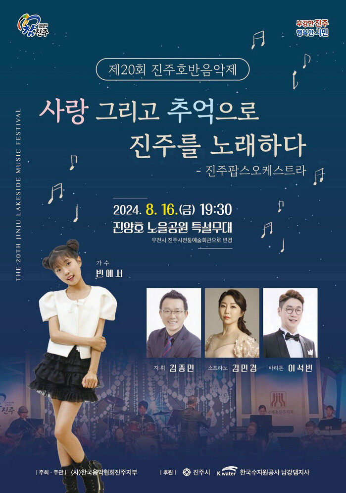 이번 음악제에는 진주시 홍보대사이자 ‘미스트롯 3’ 출신의 유명 가수 빈예서가 초대가수로 무대에 올라 진주팝스오케스트라의 연주에 맞춰 ‘청춘고백’과 ‘꼬집힌 풋사랑’을 노래하며 특별한 무대를 선사한다.