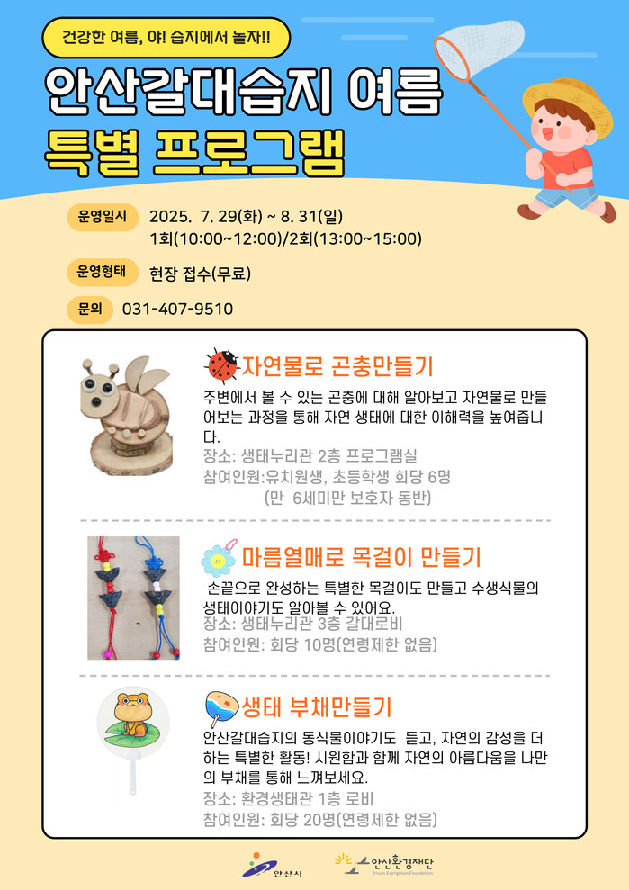 | ▲ 안산환경재단 여름방학 맞아 어린이와 학생들을 대상으로 안산갈대습지에서 특별 프로그램 운영 안내 포스터 /자료제공=안산환경재단 |