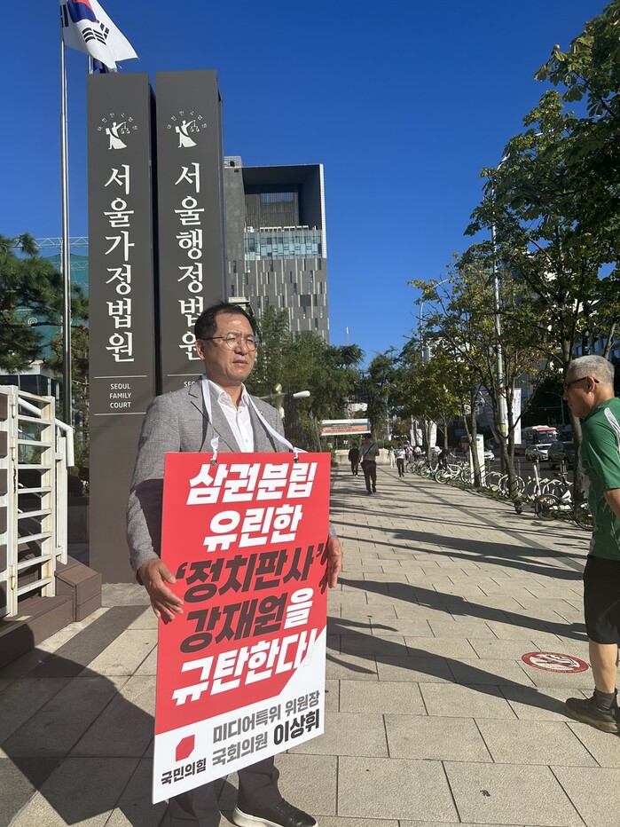 | 서울행정법원 앞에서 1인 시위를 하고 있는 이상휘 의원. |