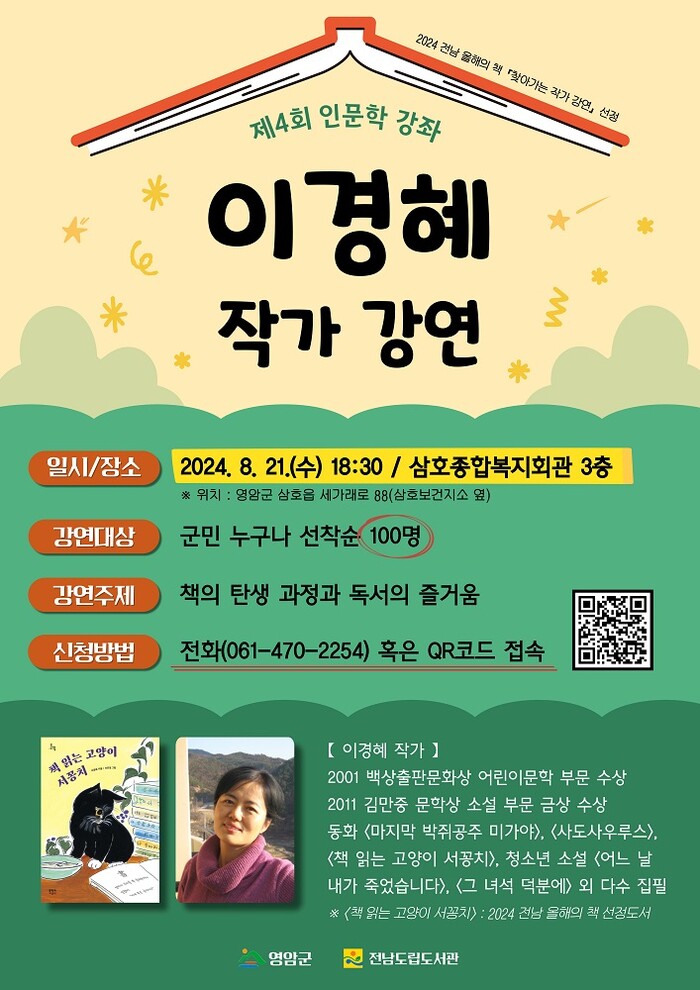 박혜영 영암군 문화예술과장은 “오랫동안 책과 가까이 지낸 작가가 들려주는 솔직하고 유쾌한 강좌에 영암군민의 많은 관심과 참여 바란다”고 말했다.