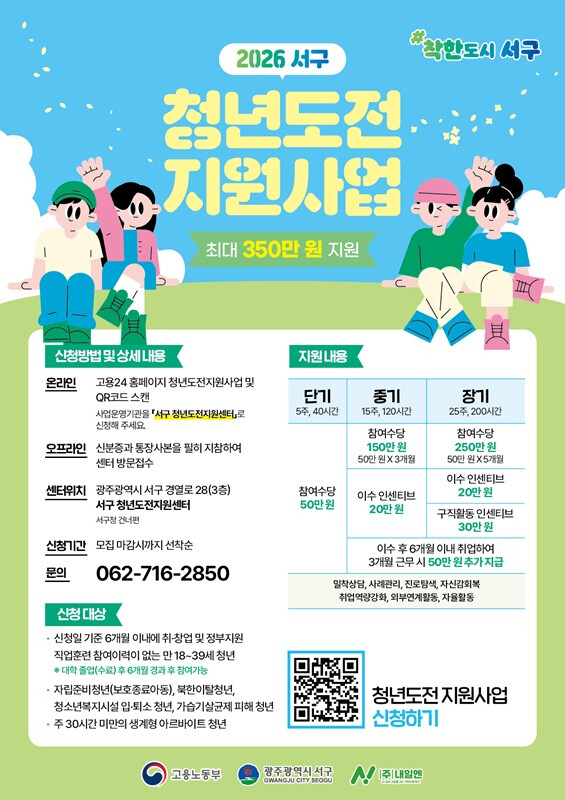 참여 신청은 ‘고용24’ 또는 서구 청년도전지원센터에서 가능하며 자세한 사항은 서구 청년도전지원센터로 문의하면 된다.