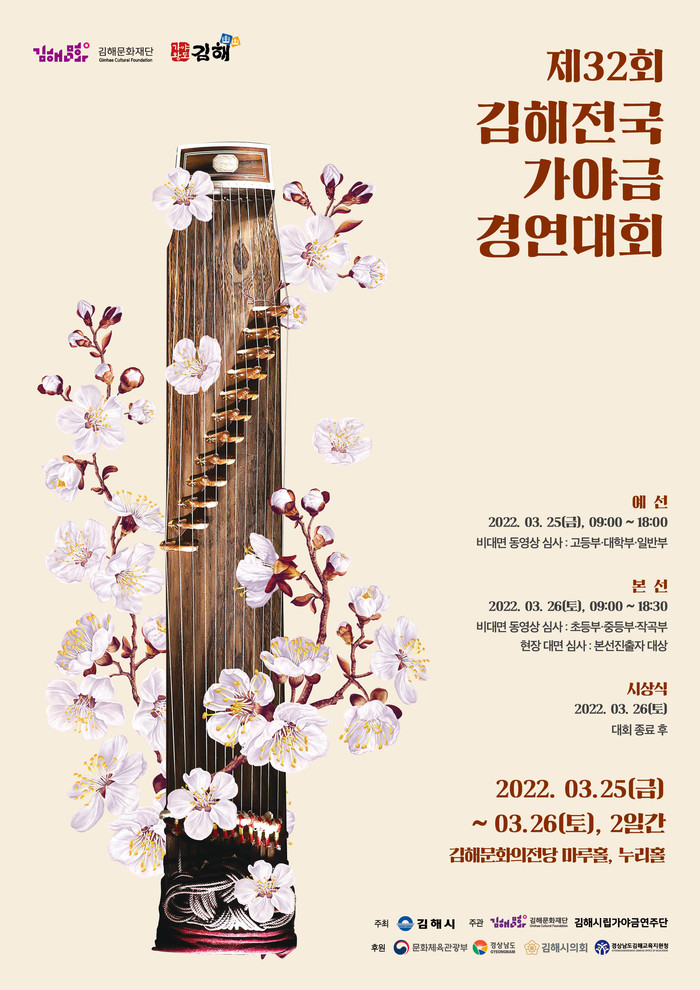 김해시가 주최하고 (재)김해문화재단이 주관하는 ‘김해전국가야금경연대회’는 올해로 32회를 맞이하며 국내 가야금 대회 중 가장 오랜 역사와 전통이 있는 국악 경연대회로 가야 문화의 전통을 계승하고 지역문화의 우수성과 활성화를 도모하기 위한 전통 예술 행사이다. 대회는 3월 25일(금) ~ 3월 26일(토) 2일간 김해문화의전당에서 개최될 예정이다.