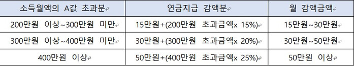 노령연금 지급개시연령에 도달하여 연금을 받을 수 있지만 소득이 있는 업무에 종사하는 경우, 지급개시연령부터 5년 동안은 일정 소득(A값) 수준을 초과하는 금액에 따라 연금액이 감액 지급된다.