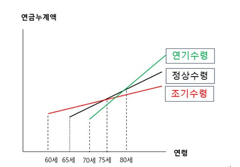 65세가 노령연금을 정상수령하는 나이일 때, 5년 조기수령하여 60세에 수령한다면 15년 뒤인 약 75세부터는 정상수령한 경우보다 누적금액이 적어진다. 만약 5년 연기하여 70세에 수령한다면 10년 뒤인 약 80세부터 정상수령한 경우보다 누적금액이 많아진다.