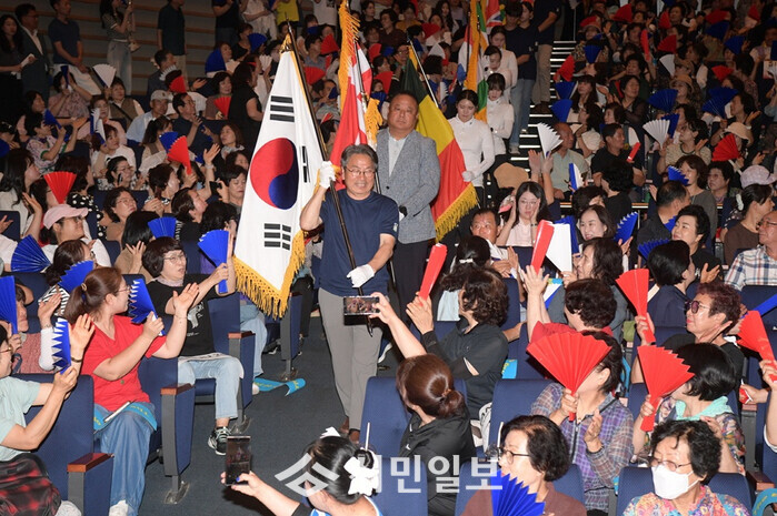 | ▲ 강기정 광주광역시장이 지난 7월 22일 오후 시청 대회의실에서 열린 ‘광주 2025 세계양궁선수권대회 시민 서포터즈 발대식’에 참석해 광주시양궁선수단과 함께 태극기 및 대회홍보기, 참여국가 국기 등을 들고 입장하고 있다. / 자료사진 = 광주광역시 제공 |