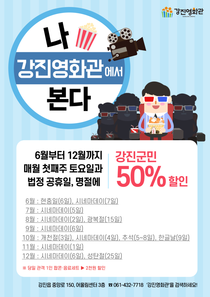 ‘강진 영화보는 날’은 강진군민을 대상으로 영화 관람료 50% 할인 혜택을 제공하는 상설 행사로, 매월 첫째주 토요일과 법정 공휴일·명절에 강진영화관에서 운영된다. 여기에 매점 팝콘·음료세트 2천원 할인 등이 더해지며 지역민들의 문화 향유 기회를 넓히고 있다. 특히 7월부터는 ‘2+1 관람 이벤트’도 새롭게 도입됐다. 유료로 영화 2편을 관람할경우 1편은 무료로 관람 또는 매점 쿠폰을 선택할 수 있는 방식으로, 청소년과 가족 단위 관람객을 중심으로 높은 만족도를 끌어내고 있다.