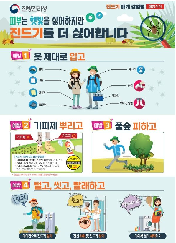 진드기 매개 감염병 예방을 위한 수칙으로 ‘풀밭, 수풀에서 긴 소매, 긴 바지 착용하기’, ‘외출 후에는 즉시 옷을 세탁하고 샤워하기’, ‘야외에서 사용한 돗자리, 작업복 등은 바로 세탁하기’, 등이며, 야외활동 후 고열, 설사, 구토 등 증상이 나타날 경우 즉시 의료기관 방문을 당부했다.