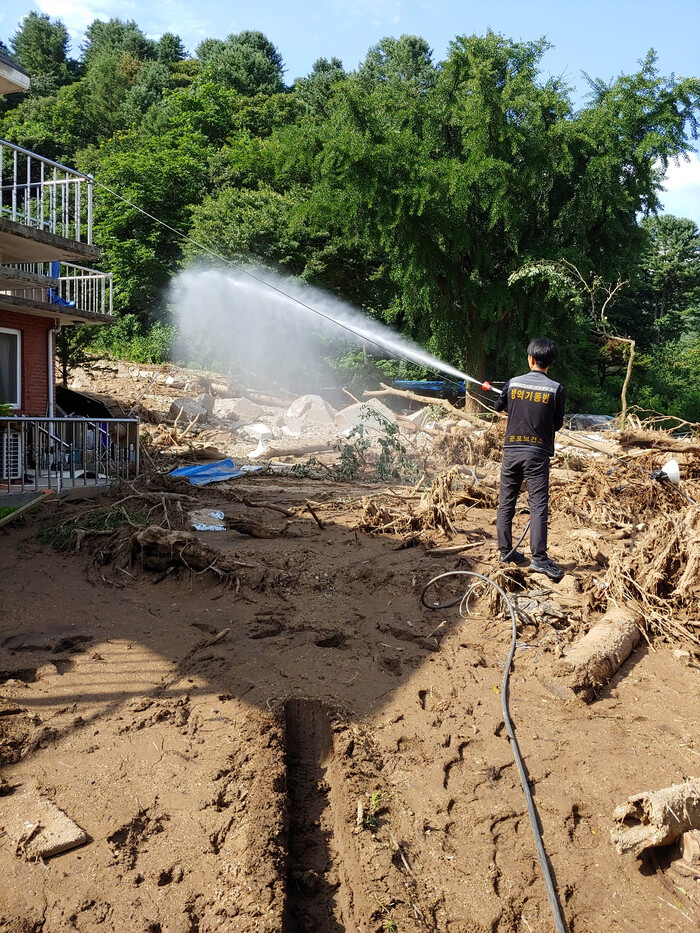 시는 7월 23일과 7월 29일, 보건소 방역전담반 4명과 방역특장차 1대를 현장에 투입하여 침수 주택가, 토사 붕괴 우려지역, 하수구, 배수로 등 위생 취약지를 중심으로 분무소독을 실시하였다.