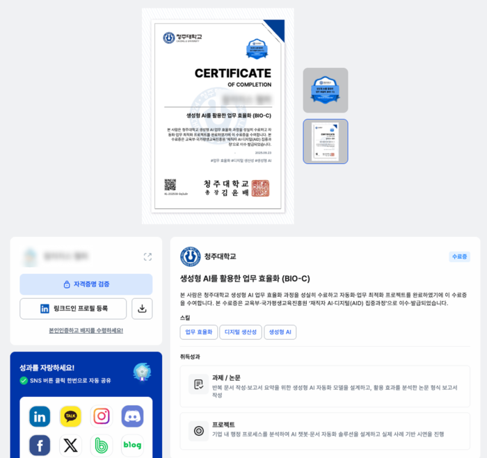 대학 관계자는 “이전에는 외부 플랫폼의 규격 안에서만 수료증을 발급할 수 있었지만, 이제는 우리 학교의 로고와 색상, 디자인 아이덴티티를 반영해 완전히 청주대학교만의 플랫폼을 운영할 수 있게 됐다”며, “교육 설계자이자 운영자로서 훨씬 주도적인 위치에서 인증 시스템을 관리하게 된 것이 가장 큰 변화”라고 설명했다.