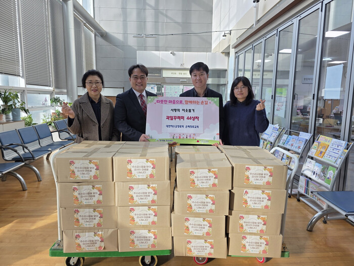 | ▲ 대한예수장로회 은혜장로교회가 11월 17일,추수감사주일을 맞아 성도들이 준비한 사랑의 과일 꾸러미 44상자를 의왕시 부곡동주민센터에 전달했다 /사진제공=의왕시 |