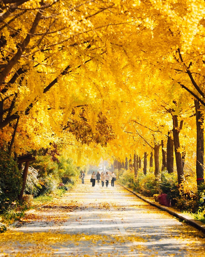 위례성길에 도착하면 ‘와’하는 환호성이 저절로 터진다. 올림픽공원 평화의 문에서 남 2문까지 이어지는 약 2.7km의 보도 양쪽 길을 따라 길게 뻗은 은행나무 가로수길이 펼쳐지기 때문이다. 매년 11월이면 아름드리 은행나무가 만들어 낸 황금빛 터널이 평생 잊을 수 없는 절경을 선사한다.