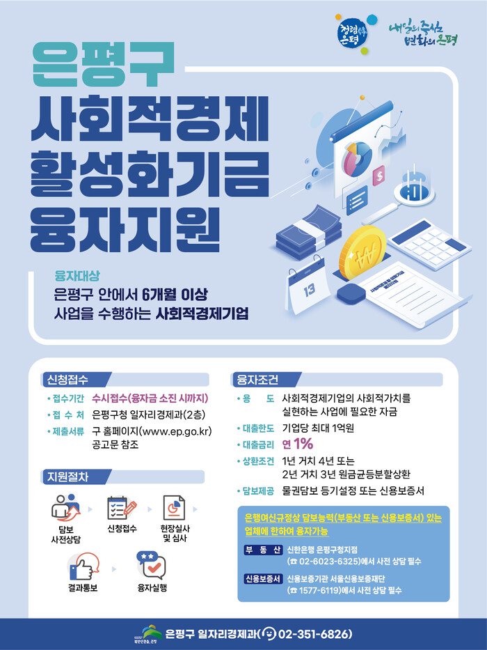 [시민일보 = 이대우 기자] 서울 은평구(구청장 김미경)는 사회적경제기업의 효과적인 성장 지원을 위해 총 5억 원 규모의 사회적경제활성화기금 융자 지원을 확대한다고 밝혔다.