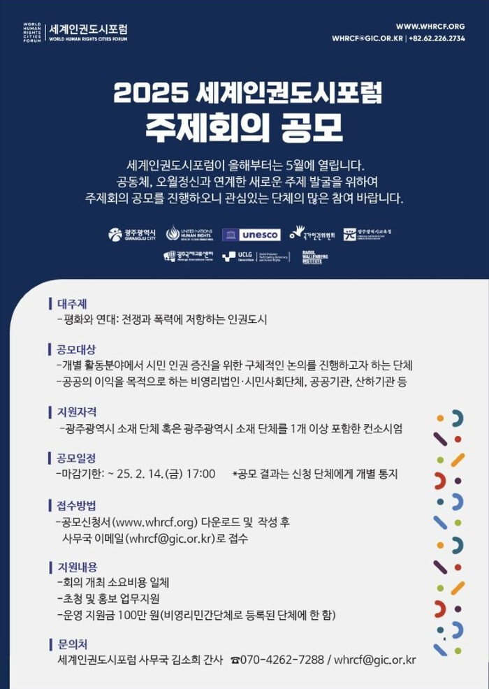 신청은 세계인권도시포럼 공식 누리집에서 공모신청서를 내려받아 작성한 뒤 사무국 이메일로 접수하면 된다. 자세한 공모 내용은 세계인권도시포럼 누리집에서 확인 가능하다.