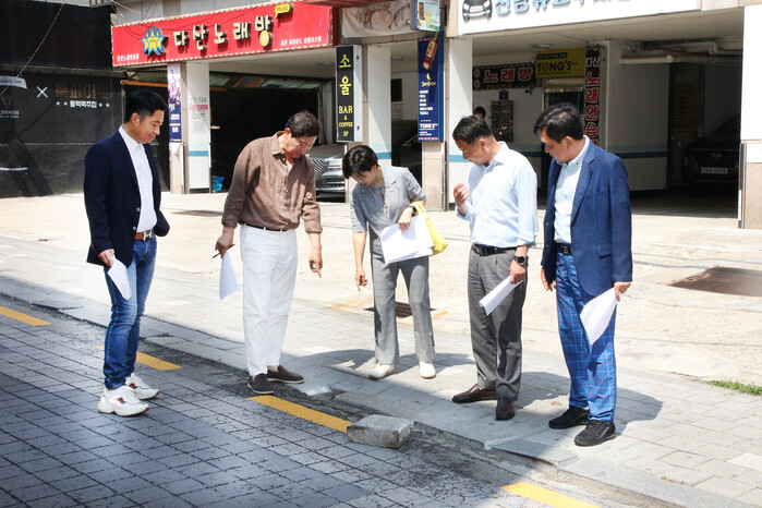 | ▲ 복지건설위원회(위원장 송재천) 위원들과 윤판오 의장이 보도블록 파손현장을 방문해 보도블록 상태를 확인하고 있다. |