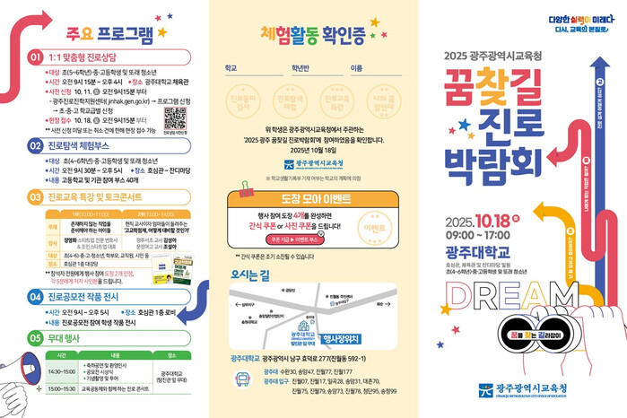 [광주=정찬남 기자] 광주광역시교육청(교육감 이정선)이 오는 18일 광주대학교 호심관, 체육관, 잔디마당 일원에서 ‘2025 광주 꿈찾길 진로박람회’를 개최한다.