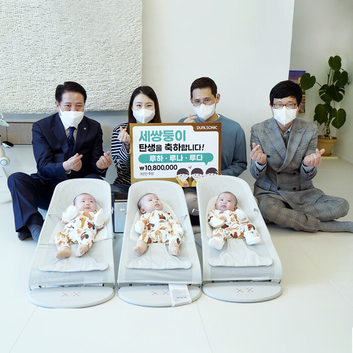 뷰티디바이스 브랜드 ‘듀얼소닉’으로 유명한 ㈜지온메디텍(대표이사 박종철)이 지난 5일 세쌍둥이를 출산한 한 가정(경기도 안양시 호계동)에 총 1080만원의 후원금을 전달했다고 밝혔다.