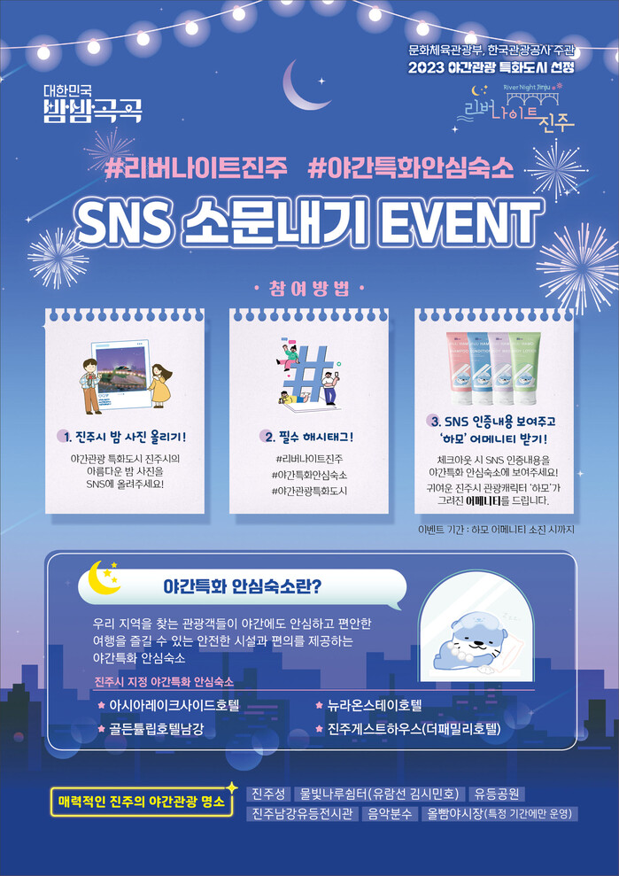 시는 이번 안심숙소 선정과 함께 SNS 이벤트도 실시한다. 이벤트 참여 방법은 선정된 안심숙소 4곳 중 한 곳에서 숙박하고 진주시의 아름다운 밤 사진을 필수 해시태그 ‘#리버나이트진주’, ‘#야간특화안심숙소’, ‘#야간관광특화도시’와 함께 SNS에 올린 후 체크아웃 시 SNS에 업로드한 내용을 보여주면 된다. 이벤트 참여자에게는 귀여운 진주시 관광캐릭터 ‘하모’가 그려진 어메니티를 제공한다.