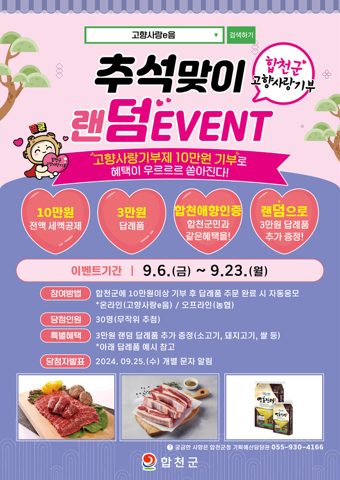 ‘추석맞이 랜“덤”이벤트’는 합천군에 10만 원 이상 고향사랑기부를 한 사람 중 무작위로 30명을 추첨하여, 3만 원 이하의 답례품을 랜덤으로 추가 증정하는 행사다.