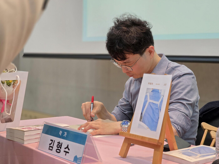 | ▲ 강연을 진행한 김형수 작가가 사인을 하는 모습 |
