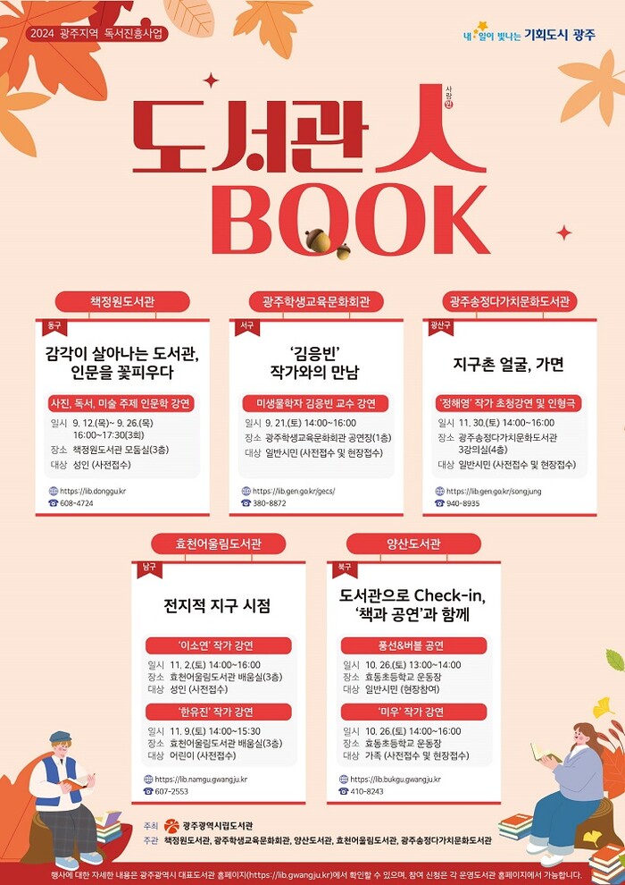 ‘도서관‧人‧book’ 행사에 대한 내용은 광주광역시대표도서관 누리집에서 확인할 수 있으며 참가 접수는 각 운영도서관 누리집에서 개별 신청 가능하다. 자세한 사항은 광주시립도서관으로 문의하면 된다.