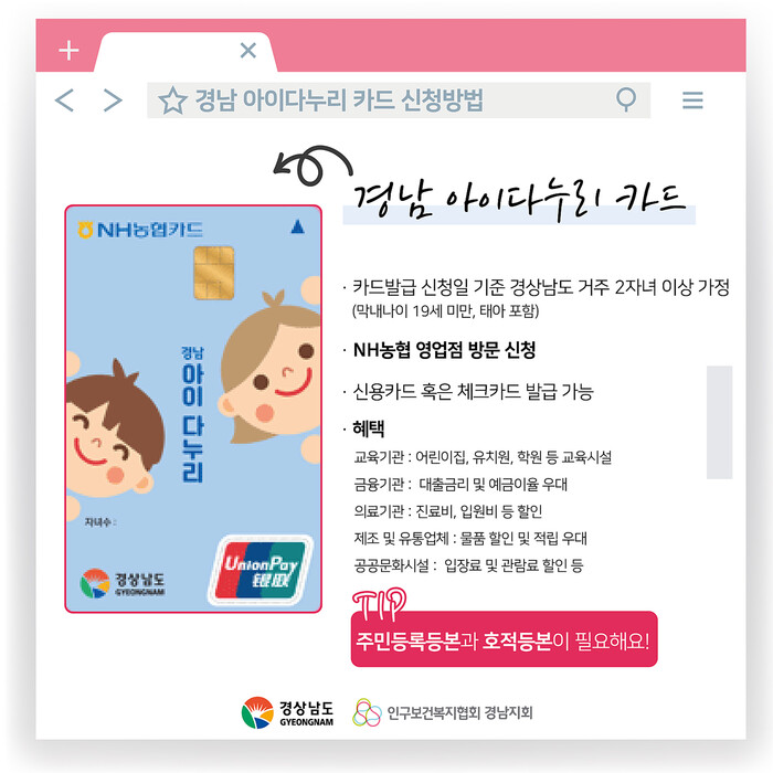 한편 ‘경남아이다누리카드’발급 대상은 막내가 만 19세 미만인 두 자녀 이상 가정(임신부 포함)이며 주민등록등본 또는 가족관계증명서, 임신부일 경우 임신증명서류를 지참하여 농협은행에 방문하여 신용카드 또는 체크가드로 발급받아 사용하면 된다.