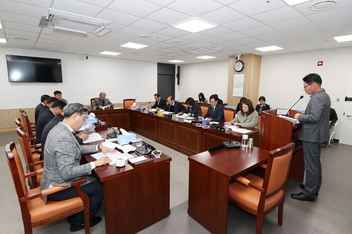 | ▲ 해남군의회가 지난 20일 군의회 운영위원실에서제19차 간담회를 진행한 가운데 해남군 관계자로부터 2024년 청년 창업형 스마트농업단지 조성사업 업무보고를 받고 있다. / 해남군의회 제공 |