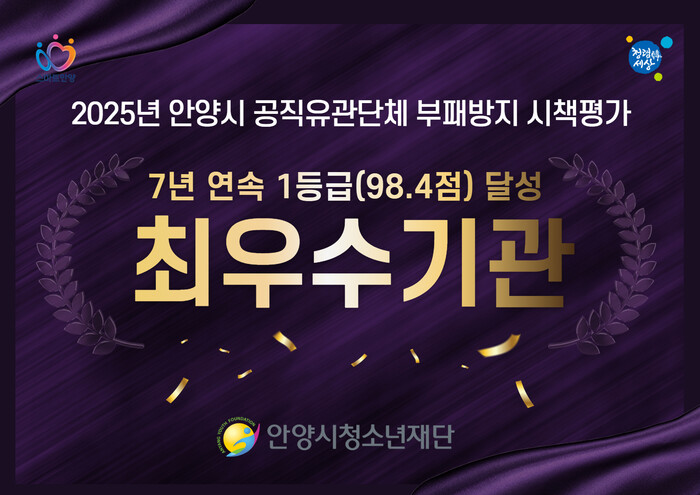 | ▲ 안양시청소년재단이 2025년 안양시 공직유관단체 부패방지 시책평가에서 7년 연속 최우수기관으로 선정됐다 /자료제공=안양시 |